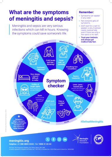 An A3 poster showing the potential signs and symptoms of meningitis and sepsis in adults (2025).
