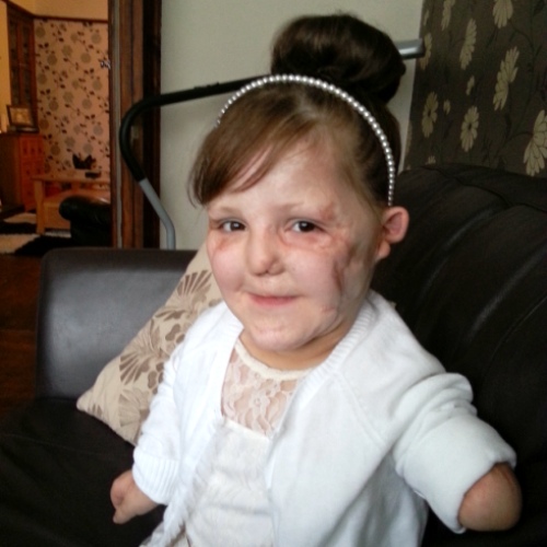 Ellie Mae survived this awful disease, but not without cost. She has had 76 operations, lost both of her legs, her left arm, her bottom, the septum of her nose and part of her left ear; she also had to have a colostomy bag fitted. She has been skin grafted on every part of her body apart from a small space on her tummy. Her growth plates are deformed and she has no hip movement; her legs haven’t grown since her illness. She is unable to sit down and so is constantly weight bearing through her legs, which puts immense pressure on her pelvis and her spine.
